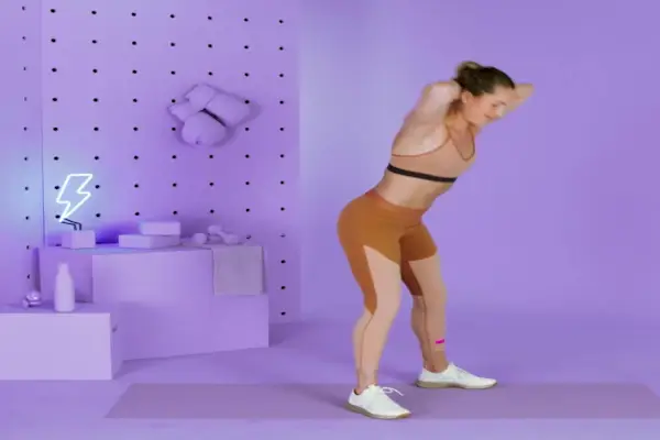 - Senken Sie den Rücken in einer fließenden Bewegung in die Hocke und wiederholen Sie den Vorgang mit einer Drehung zur gegenüberliegenden Seite. Das ist 1 Wiederholung.