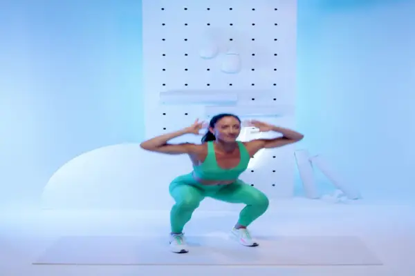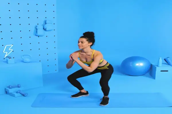 - Gehen Sie in die Hocke, wobei der Oberkörper im 45-Grad-Winkel nach vorne geneigt ist und die Hände vor der Brust verschränkt sind.