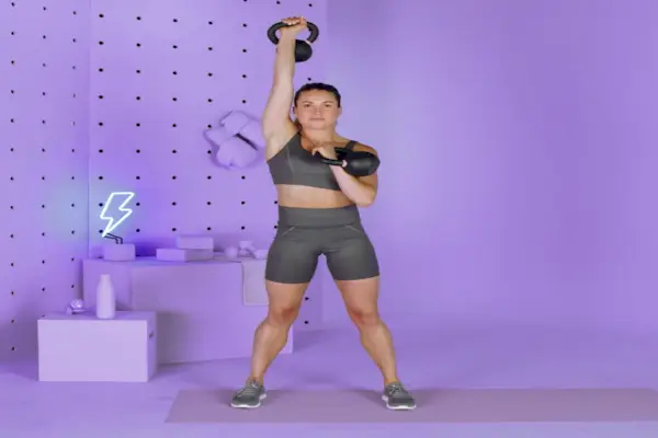 - Stehen Sie mit hüftbreit auseinander stehenden Füßen und halten Sie Kettlebells oder Kurzhanteln in jeder Hand, mit angewinkelten Armen und schmalen Ellbogen.