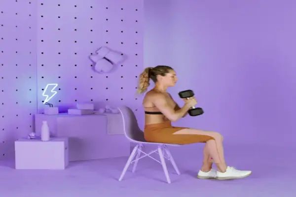 - Setzen Sie sich auf einen Stuhl und halten Sie eine Hantel mit beiden Händen vor der Brust.