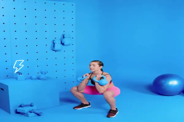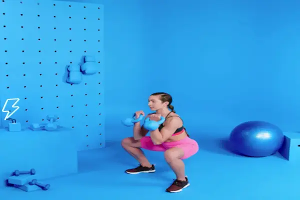 - Beginnen Sie in einer niedrigen Kniebeugeposition, halten Sie in jeder Hand eine Kettlebell oder Hantel und strecken Sie die Arme gerade nach unten, sodass sich die Gewichte zwischen den Füßen befinden.