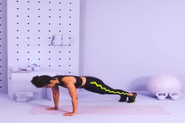 - Beginnen Sie in einer hohen Plankenposition mit den Händen direkt unter den Schultern.