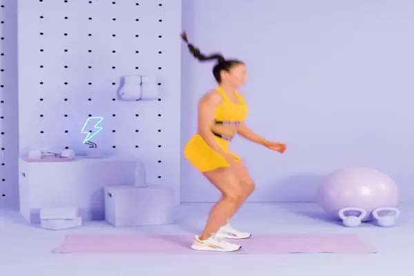 - Landen Sie sanft auf den Fußballen und senken Sie sich sofort in die nächste Hocke. Das ist 1 Wiederholung.