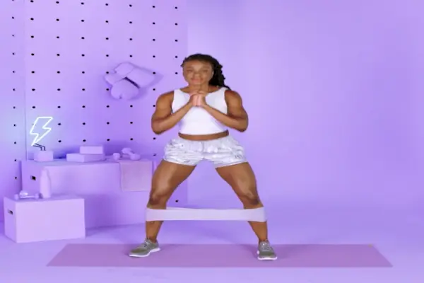 - Stehen Sie mit einem Widerstandsband knapp unter den Knien, die Füße etwas weiter als hüftbreit auseinander und die Hände vor der Brust verschränkt.