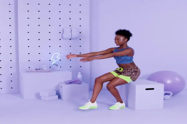 So geht's: Beginnen Sie, mit dem Gesicht von einer Kiste (oder einem Stuhl) wegzustehen. Spannen Sie den Rumpf an und drücken Sie die Hüften nach hinten, um nach unten zu sinken, bis das Gesäß die Box berührt. Sobald der Sitz die Box berührt, drücken Sie durch die Fersen, um in eine stehende Position zurückzukehren.