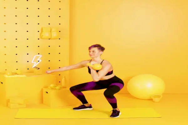 2. Goblet-Kniebeuge. Sobald Sie über eine gute Mechanik bei Kniebeugen mit dem eigenen Körpergewicht verfügen, empfiehlt Luciani, den Widerstand nach und nach hinzuzufügen. Sie mag Goblet-Kniebeugen B. mit einer Kettlebell oder Kurzhantel, da Sie in kleinen Schritten Fortschritte machen können.