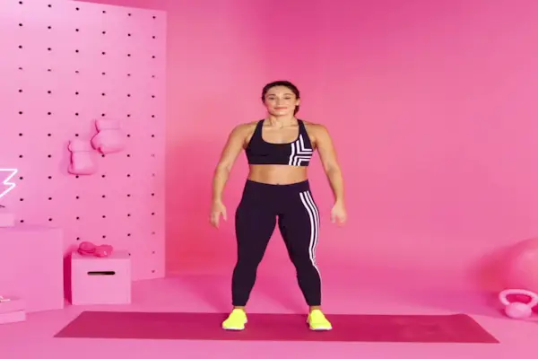 1. Passen Sie Ihre Haltung entsprechend Ihrer Beinbeweglichkeit an. Beginnen Sie mit schulterbreit auseinander stehenden Füßen, den Zehen nach vorne (und bei 11 und 1 Uhr leicht nach außen) und den Armen an den Seiten. Wenn Sie längere Beine haben, müssen Sie möglicherweise Ihre Füße verbreitern, um mehr Platz für die Hüften zu schaffen, sagt Luciani.