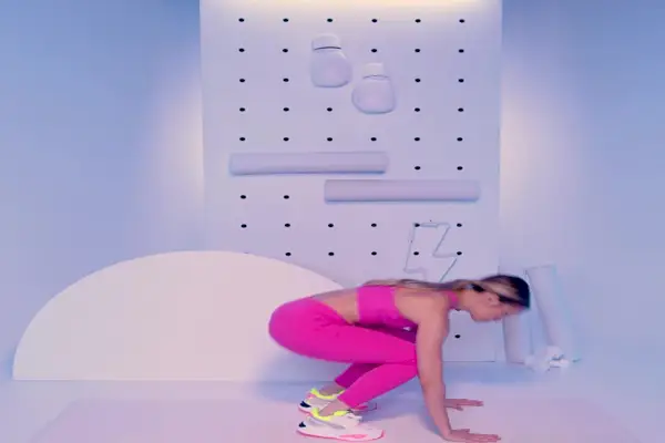 - Springen Sie mit beiden Füßen nach hinten, sodass Sie sich in einer hohen Plankenposition befinden.