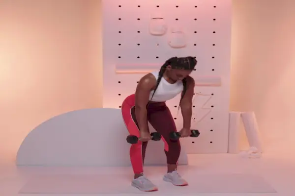 - Drücken Sie die Schulterblätter zusammen und ziehen Sie die Hanteln in Richtung Brustkorb.